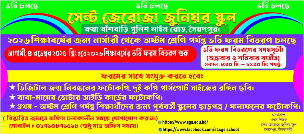 প্রধান শিক্ষকের কার্যালয় সেন্ট জেরোজা স্কুল, সৈয়দপুর, নীলফামারী। ই-মেইল: stgerosasschool78@gmail.com ওয়েবসাইট: www.sgs.edu.bd মোবাইল: 01309136504